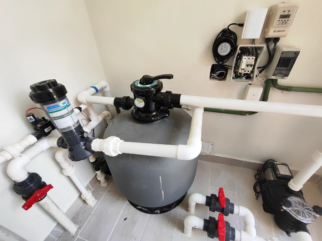 Ablandadores de agua para reducir el calcio, filtros para partículas y productos químicos, luces UV para eliminar las bacterias y sistemas de filtración de la piscina.